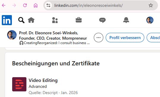 Now you can check out my LinkedIn badge for Descript Advanced on my LinkedIn profile under my name Elona Sui Winkles. And now you can also see when I recorded this video for you because I just connected my LinkedIn profile and Descript today. Then you will see that I will publish this episode probably in late March for season three. Trust me, I really walk my talk when I encourage you to batch record in quiet times to repurpose in seasons, as discussed in episode four, [00:06:00] seasonal video podcast strategies to avoid burnout. let's get back to our episode about scaling your video presence in multiple languages.